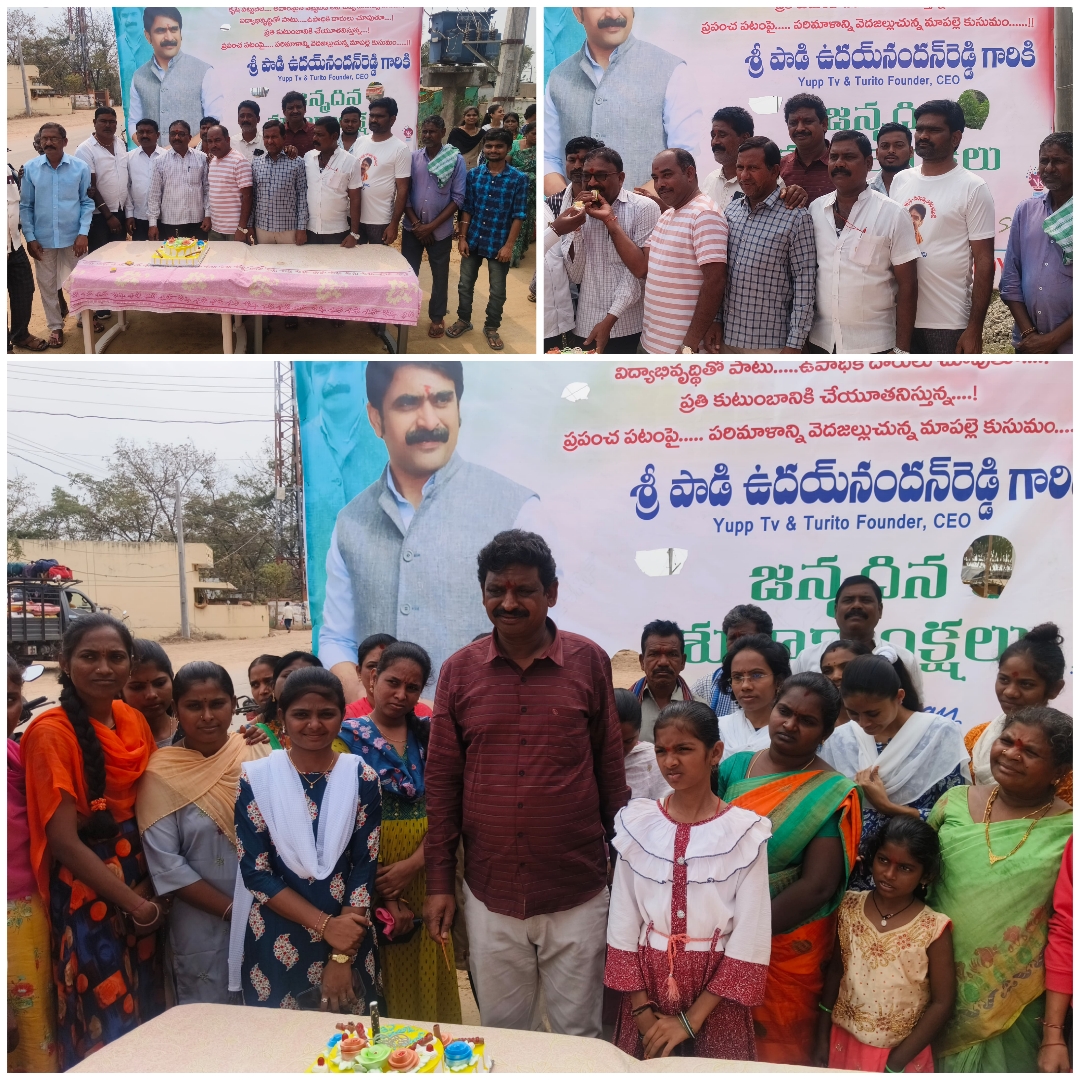 వీణవంక మండలకేంద్రంలో యుప్ టీవీ అధినేత పాడి ఉదయ్ నందన్ రెడ్డి జన్మదిన వేడుకలును యాప్ టీవీ ఉద్యోగులు మరియు టూరిటో మహిళా ఉద్యోగులు,వీణవంక గ్రామస్తులు ఘనంగా నిర్వహించడం జరిగింది.ఈ సందర్భంగా ఉద్యోగులు మరియు స్థానికులు మాట్లాడుతూ అన్నా అంటే నేనున్నానని ఈ నియోజకవర్గంలోని ఐదు మండలాల పేద ప్రజలకు అండగా ఉంటూ,నిరుపేద విద్యార్థుల భవిష్యత్తుకు బంగారు బాటలు వేస్తున్న పాడి ఉదయ్ నందన్ రెడ్డి నిండు నూరేళ్లు అష్టైశ్వర్యాలతో ఆయురారోగ్యాలతో సుఖ సంతోషాలతో జీవించాలని వారు ఆకాంక్షించారు.