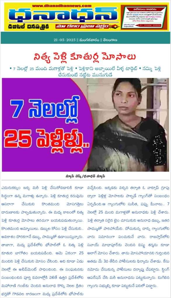 - <a href="mailto:?subject=నిత్య పెళ్లి కూతుర్ల మోసాలు…7 నెలల్లో 25 మంది మగాళ్లతో పెళ్లి..&body=నిత్య పెళ్లి కూతుర్ల మోసాలు…7 నెలల్లో 25 మంది మగాళ్లతో పెళ్లి.. - https://dhanadhannews.com/cheating-by-brides-who-are-always-married-married-to-25-men-in-7-months/" class="cb-em-icon">