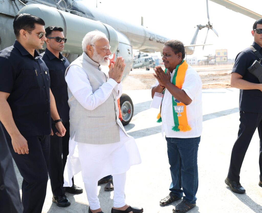 జమ్మికుంట(ధనాధన్ న్యూస్)మే 09:బుధవారం బిజెపి బహిరంగ సభకు వేములవాడ కు వచ్చిన భారత ప్రధాని నరేంద్ర మోడీకి హెలిప్యాడ్ వద్ద బిజెపి జమ్మికుంట పట్టణ అధ్యక్షులు జీడి మల్లేష్ స్వాగతం పలకడం జరిగింది.నరేంద్ర మోడీకి స్వాగతం పలకడానికి అవకాశం రావడం నా అదృష్టంగా భావిస్తున్నానని,అంత గొప్ప నాయకున్ని కలుసుకోవడం చాలా సంతోషంగా ఉందని,ఈ అవకాశం కల్పించిన బిజెపి పార్లమెంట్ అభ్యర్థి బండి సంజయ్ కుమార్ కి, జిల్లా అధ్యక్షులు గంగాడి కృష్ణారెడ్డి లకు మల్లేష్ కృతజ్ఞతలు తెలిపారు.