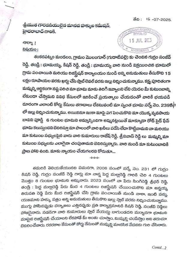 - హెచ్ఆర్సీ ని ఆశ్రయించిన బాధితుడు సింగిరెడ్డి శ్రీధర్ రెడ్డి