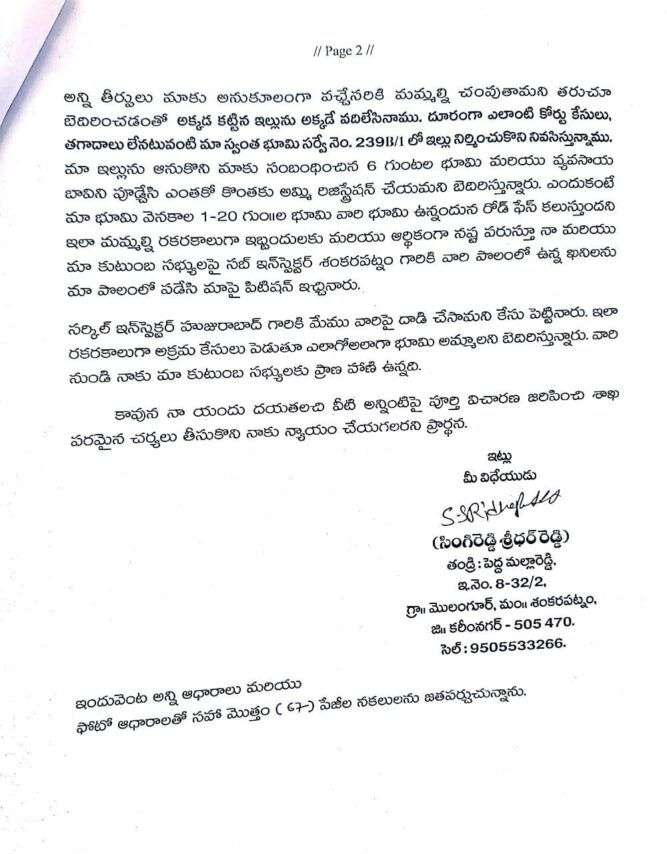 శంకరపట్నం సబ్ ఇన్స్పెక్టర్కు వారి పొలంలోని ఖనీలను తమ పొలంలో పడేసి ఫిర్యాదు చేశారని, హుజురాబాద్ సర్కిల్ ఇన్స్పెక్టర్కు తమపై దాడి చేశారని తప్పుడు కేసులు పెట్టారని శ్రీధర్ రెడ్డి తెలిపారు. ఈ విధంగా రకరకాలుగా అక్రమ కేసులు పెడుతూ, ఎలాగైనా భూమిని అమ్మించాలని బెదిరిస్తున్నారని ఆయన వాపోయారు. వారి నుండి తనకు, తన కుటుంబ సభ్యులకు ప్రాణహాని ఉందని, దీనిపై పూర్తి విచారణ జరిపి తగిన చర్యలు తీసుకొని తమకు న్యాయం చేయాలని శ్రీధర్ రెడ్డి మానవ హక్కుల కమిషన్ ను కోరారు.